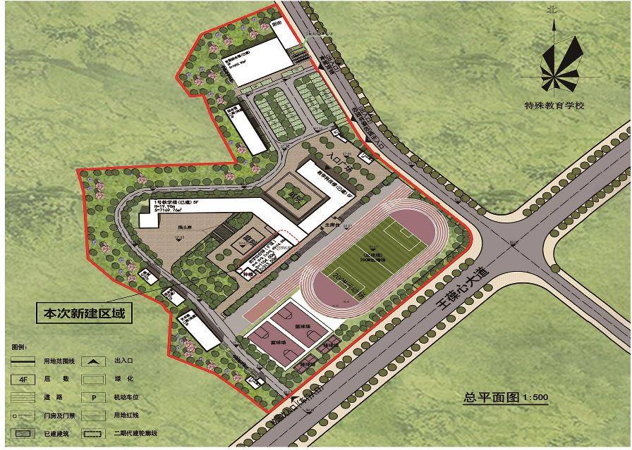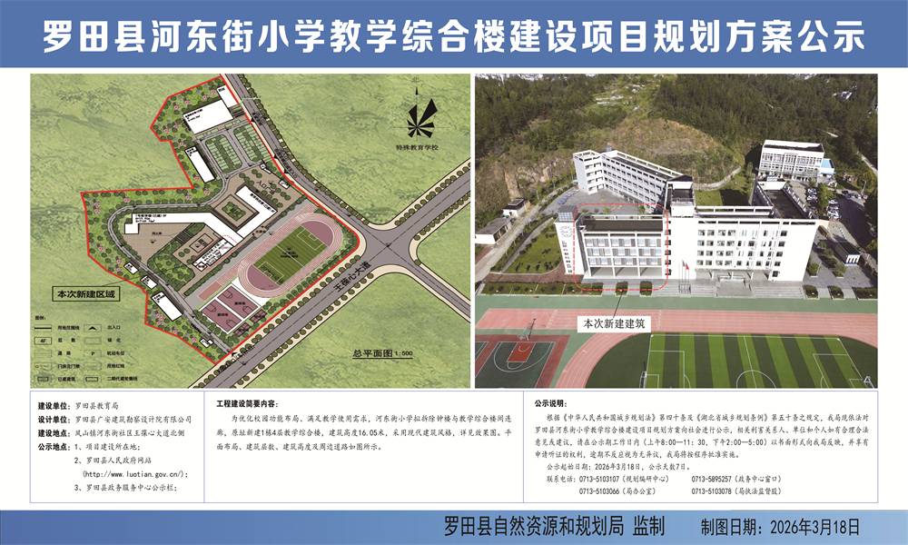 为优化校园功能布局,满足教学使用需求,河东街小学拟拆除钟楼与教学综合楼间连廊,原址新建1栋4层教学综合楼,建筑高度16.05米,采用现代建筑风格,详见效果图。平面布局,建筑层数,建筑高度及周边道路如图所示。