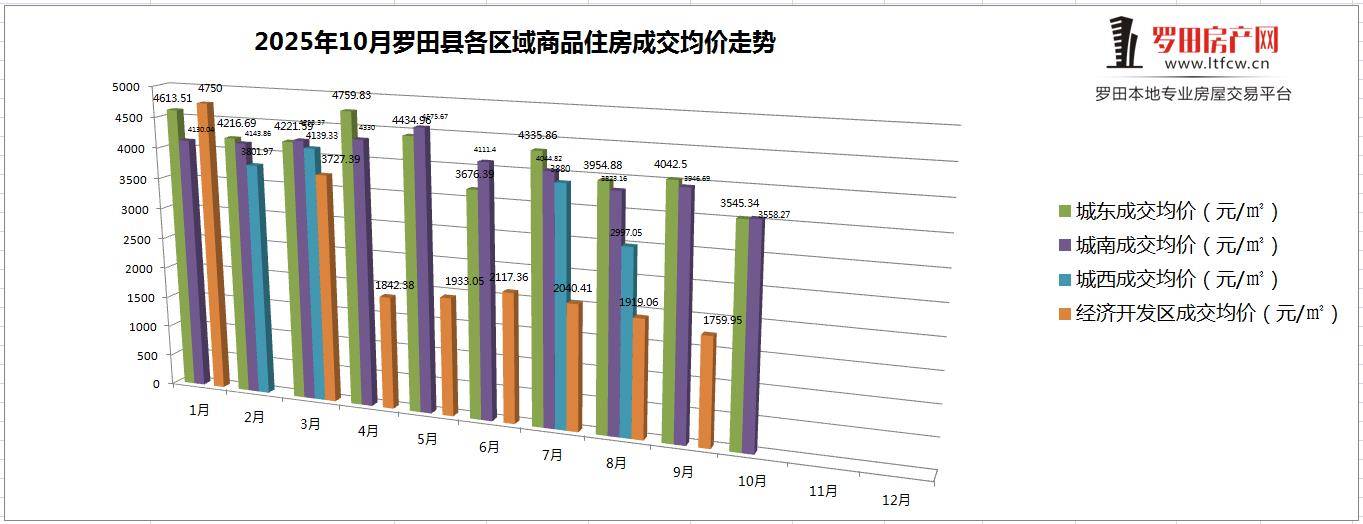 2025年10月份罗田县各区成交均价相比2025年9月份,城东区成交均价下跌12.29%,城南区成交均价下跌9.84%,经济开发区和城西区10月无住宅成交数据;