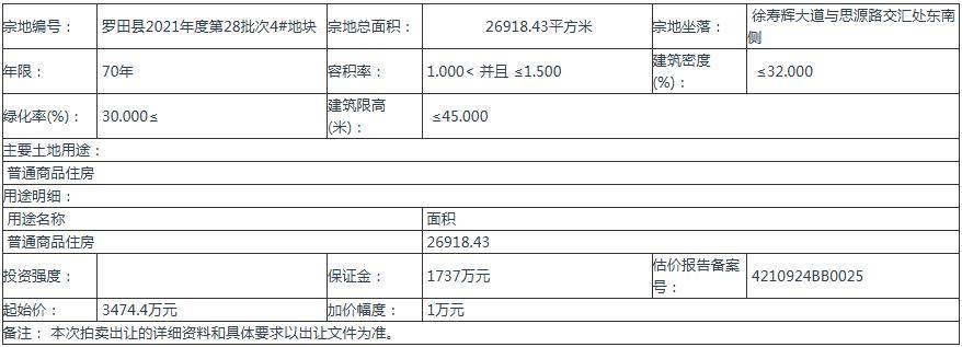 四、 本次拍卖出让的详细资料和具体要求,见拍卖出让文件。申请人可于2025年11月24日至2025年12月14日到罗田县土地收购储备交易中心获取拍卖出让 文件。