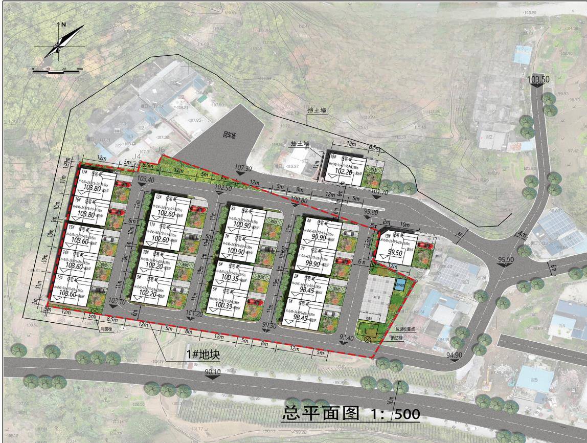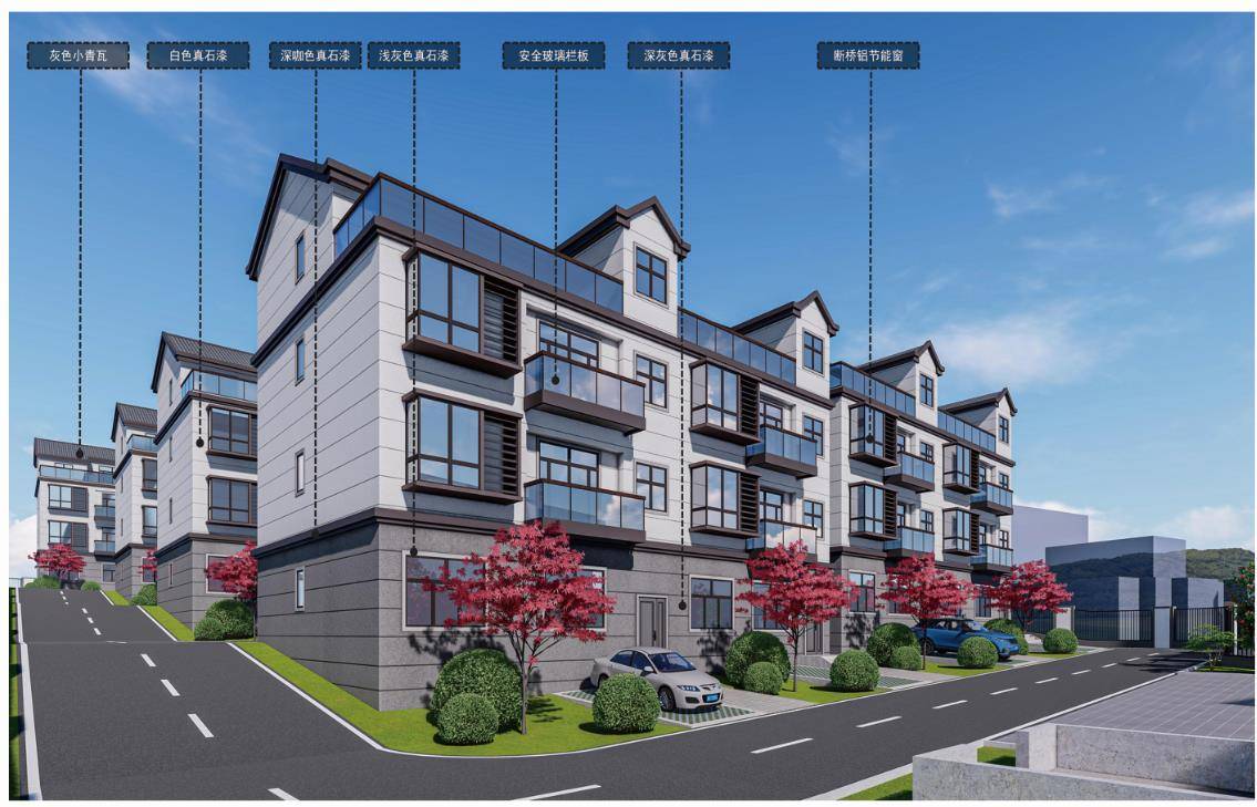 规划东西向布置4排四层房屋(第四层局部露台),房屋建筑高度13.95米,配套建设垃圾收集点,污水处理设施,消防设施等。采用现代建筑风格。